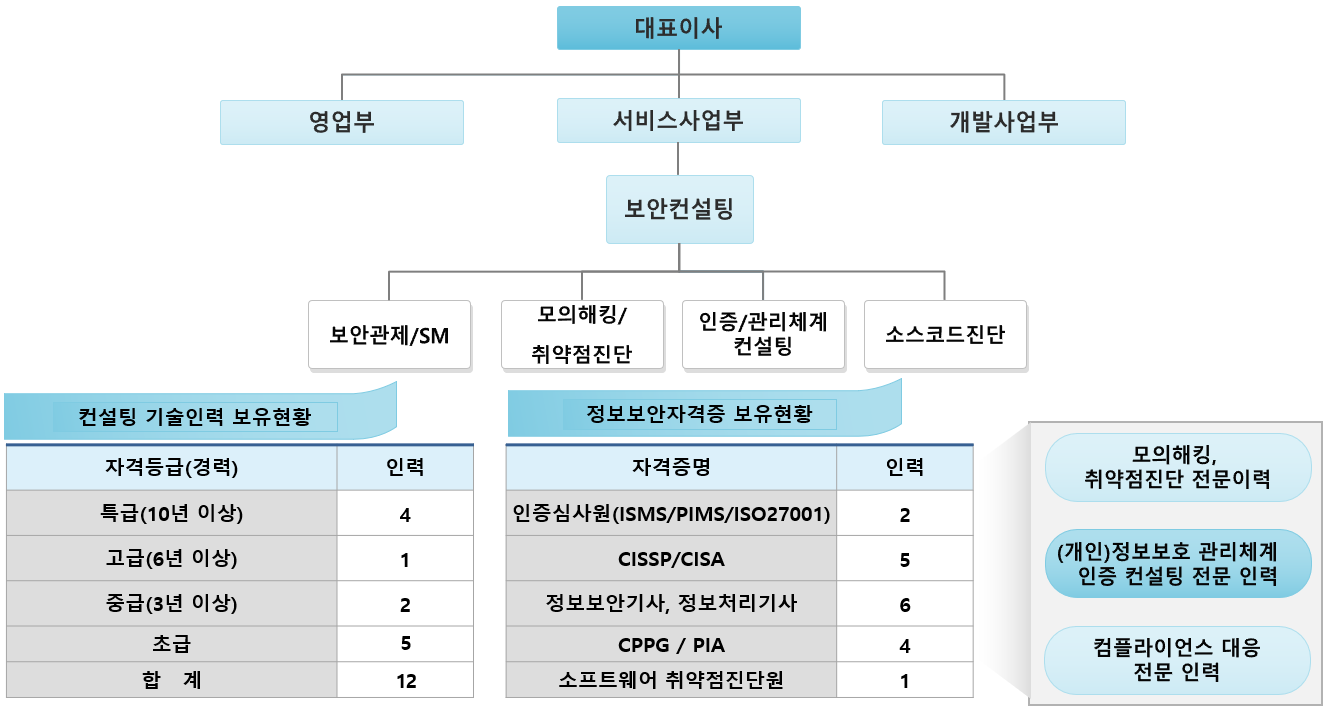 (개인)정보보호 전문인력으로 편성된 서비스사업부와 개발사업부, 영업부로 구성되었으며, 컨설팅 기술인력 90%이상이 중급 이상의 경험 많은 전문인력으로 각종 정보보안자격증을 보유하고 있습니다.